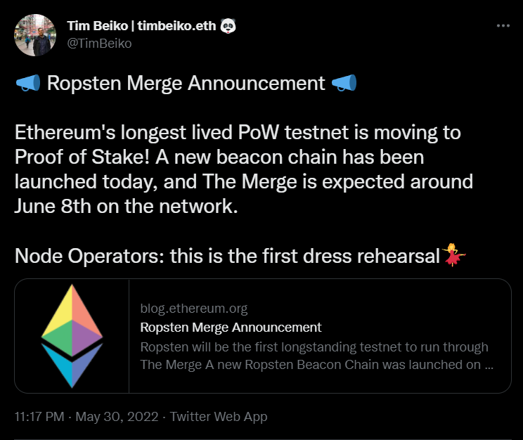 В рамках тестирования будет проведено обновление Bellatrix, которое отвечает за переход на PoS. Ожидается, что само обновление Bellatrix состоится 2 июня, а операторы нод смогут получить больше деталей о переходе сети на PoS уже 3 июня.