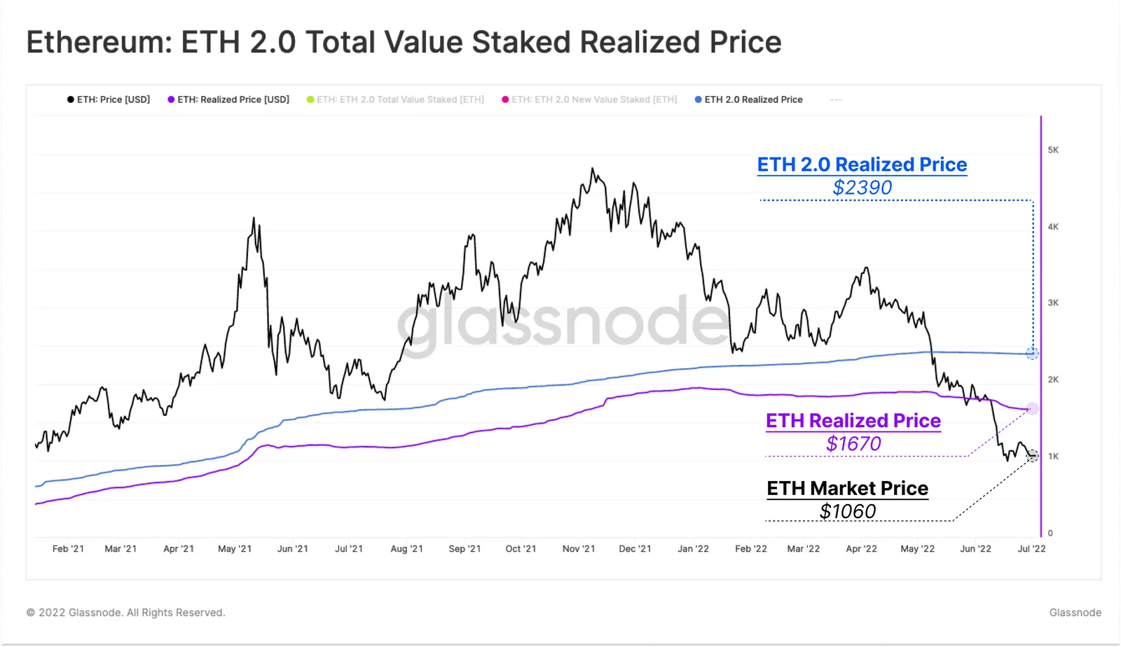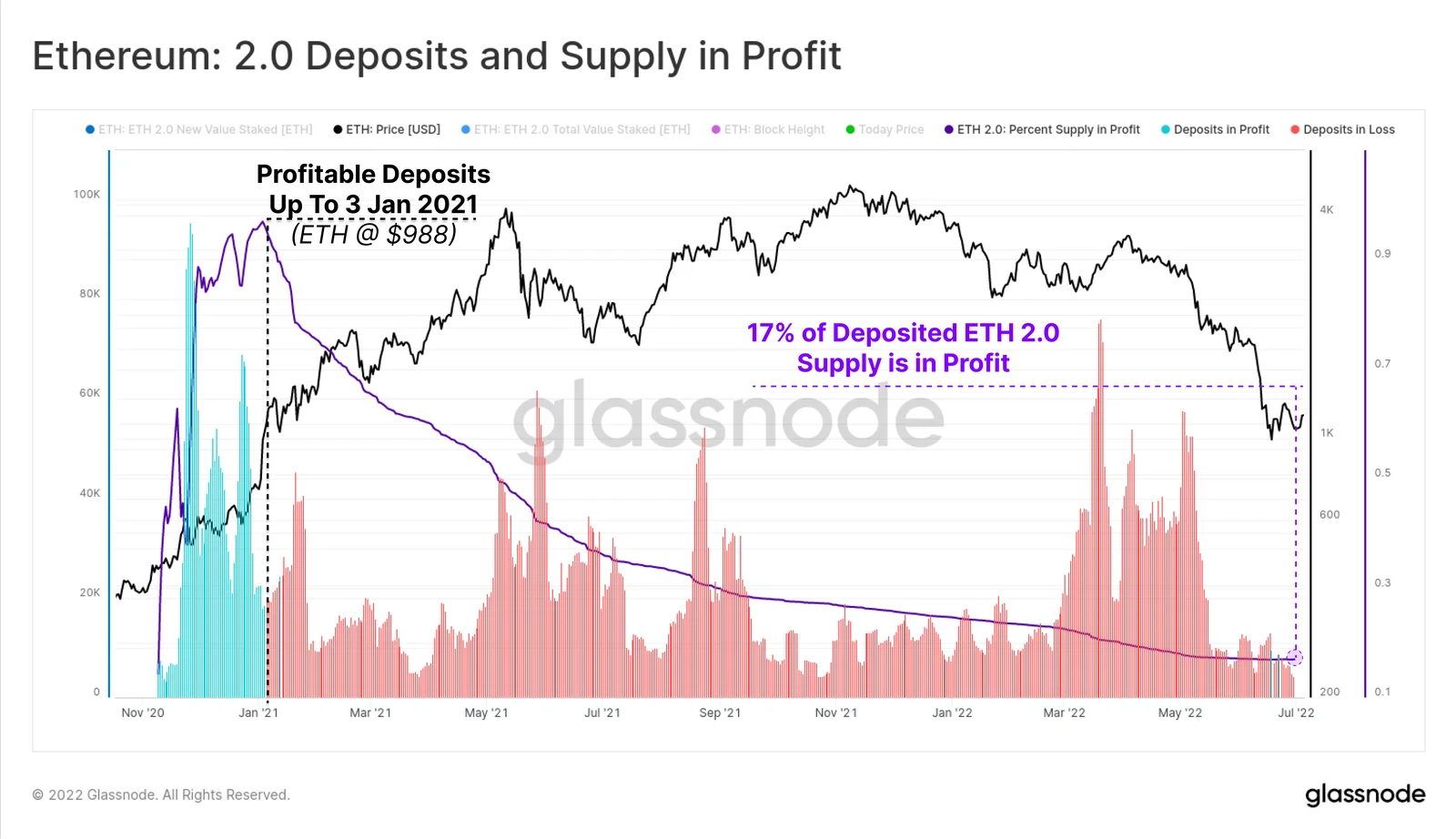 При полученной цене реализации $2390 за 1 ЕTH и при курсе ETH на 6 июля в $1060, большинство инвесторов, сделавших ставку на Ethereum 2.0, в среднем несут убытки на 55%. Если сравнить это с реализованной ценой для количества ETH, которое было отправлено в стекинг инвесторами за все время, то убытки составляют 36%. Из этого следует вывод, что все депозиты Ethereum 2.0 приносящие прибыль, были сделаны еще в январе 2021 года, когда ETH стоил меньше $1000. То есть только 17% от всего количества депозитов приносят прибыль.
