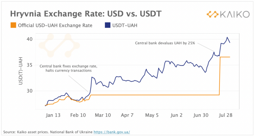 В итоге котировки USDT в гривне выросли почти на 40% с конца февраля. По мнению Kaiko, это демонстрирует потерю стоимости местной валюты по отношению к доллару США даже вопреки усилиям Центробанка.