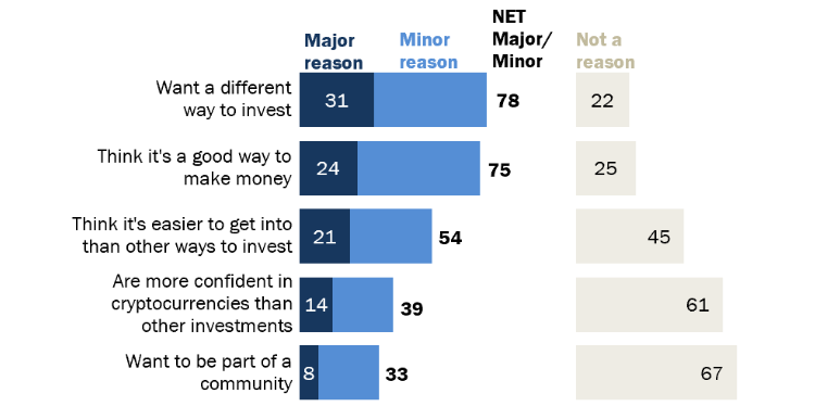 Подавляющее большинство респондентов заинтересовались криптовалютой, потому что искали «альтернативный способ инвестирования» и «легкий способ заработка».