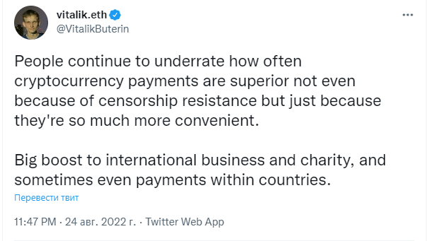 Соучредитель Ethereum Виталик Бутерин полагает, что преимущества криптовалюты при платежах часто недооценивают. В качестве ключевых плюсов перед фитаными платежами он указал на удобство международных платежей и переводов благотворительным организациям.