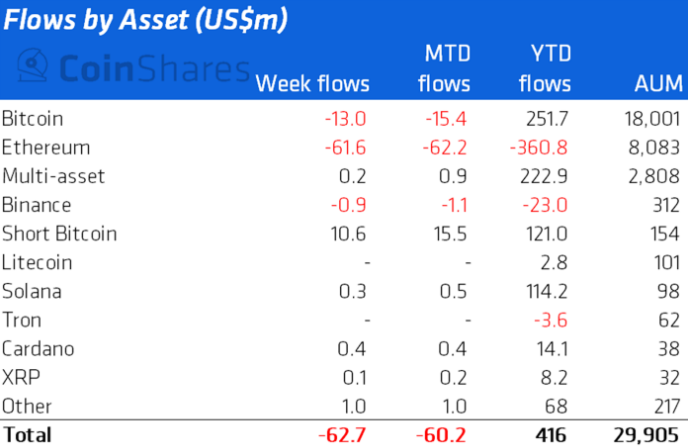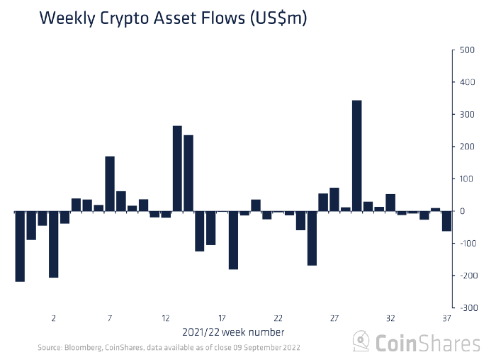 Отток средств из криптовалютных инвестиционных продуктов с 3 по 9 сентября составил $63 млн против $8,7 млн неделей ранее (с поправкой на приток в медвежьи биткоин-фонды в размере $17,9 млн). Такие оценки привели аналитики CoinShares.