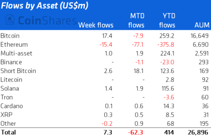 В структуры, которые позволяют открывать шорт по первой криптовалюте, поступили $2,6 млн. Их AUM приблизился к рекордным $169 млн.