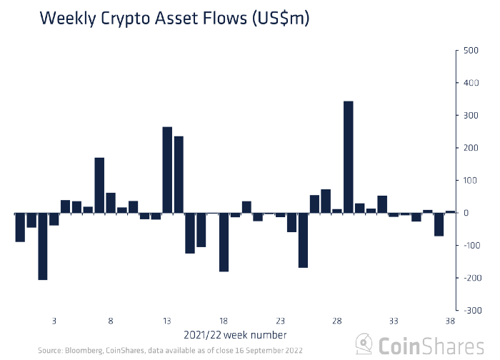 Приток средств в криптовалютные инвестиционные продукты с 10 по 16 сентября составил $7,3 млн против оттока в $63 млн неделей ранее. Такие оценки привели аналитики CoinShares.