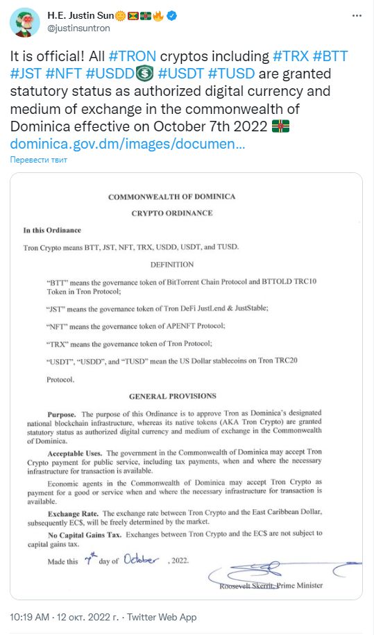 Как написал Джастин Сан в Твиттере, все цифровые активы, выпущенные в блокчейне TRON, получили на территории Доминики «официальный статус разрешённой цифровой валюты и средства обмена». В подтверждение своих слов он разместил официальный документ.