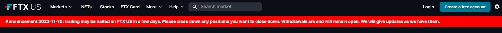 10 ноября Бэнкман-Фрид заявил, что кризис ликвидности не затронул FTX US. Однако американская площадка разместила на сайте объявление о возможном прекращении торговли в ближайшие дни. Трейдерам рекомендовано закрыть позиции, вывод средств остается возможным.
