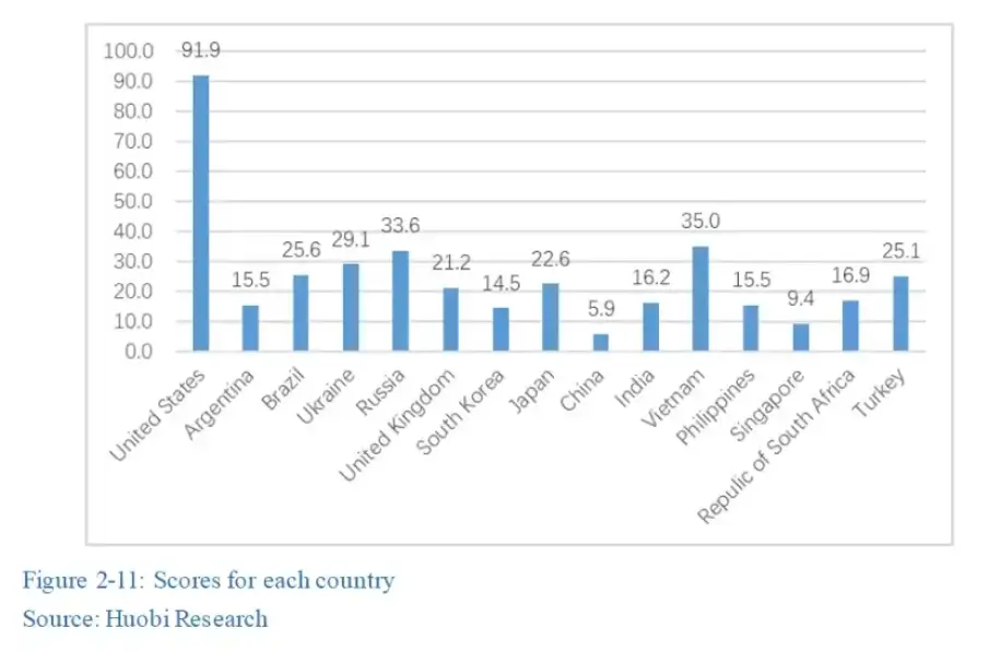 Однако по совокупности индексов активности в рейтинге лидируют именно США, так как здесь крипторынок достиг «наибольшей зрелости». Вьетнаму досталось второе место, а третье место заняла РФ. Данные по общим результатам исследования можно увидеть на диаграмме ниже.