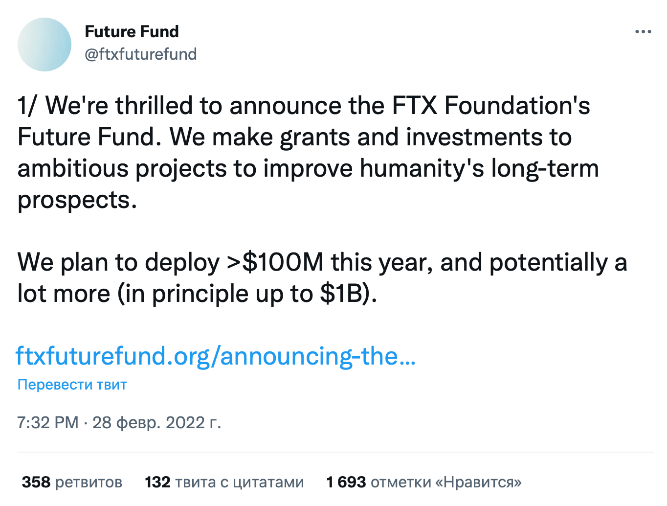 Твит Future Fund с планами о будущих пожертвованиях на 2022 год