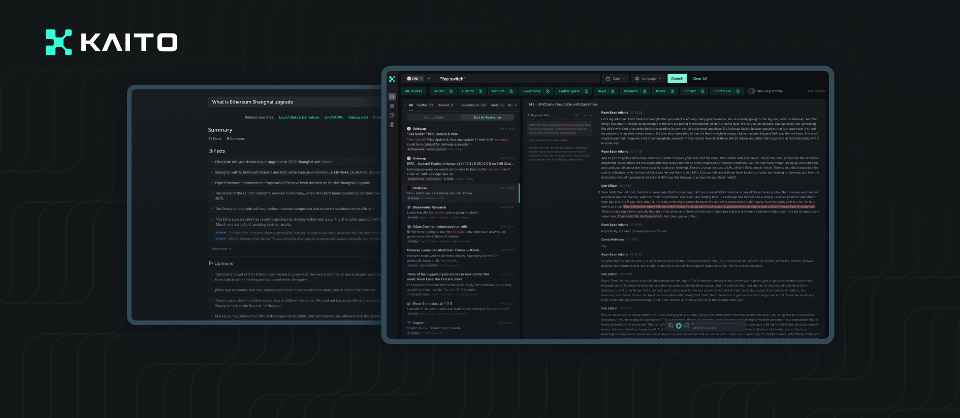 Поисковая система Kaito включает в список источников «Твиттер», «Дискорд», форумы протоколов децентрализованных финансов, подкасты и блоги. Текущая альфа-версия Kaito умеет различать в выдаче факты и мнения. Стартап также работает над интеграцией ChatGPT/GPT-3, однако детали нововведения остаются нераскрыты. В будущем в Kaito хотят отображать и ончейн-данные через провайдеров вроде Glassnode и Dune Analytics.