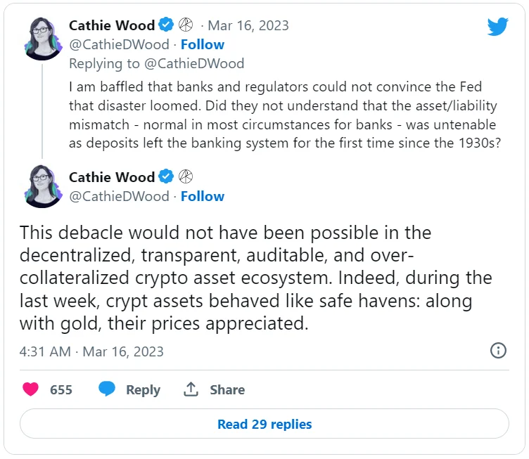 «Криптовалюты не приводили банки SVB и Signature к банкротству. На мой взгляд, основным виновником является политика ФРС. <> Я озадачена тем, что регуляторы не смогли убедить ФРС в наличии надвигающейся катастрофы <> Этот крах был бы невозможен в децентрализованной, прозрачной и чрезмерно обеспеченной экосистеме криптоактивов», — заключила Вуд.