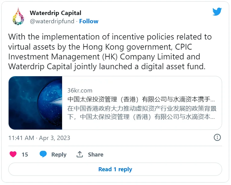 Waterdrip Capital сообщила, что запуск фондов связан с реализацией правительством Гонконга стимулирующей политики в области цифровых активов.