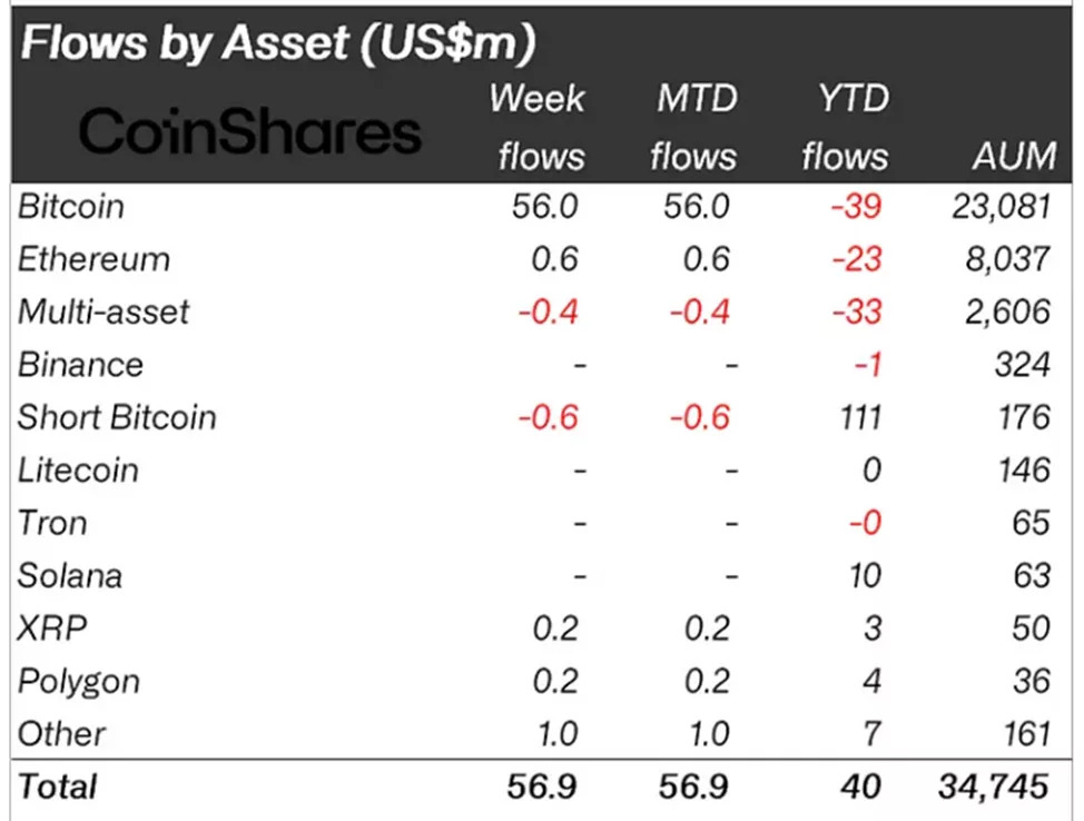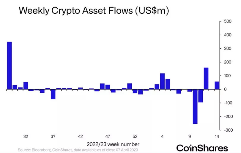Приток средств в криптовалютные инвестиционные продукты с 1 по 7 апреля составил $57 млн против $2,5 млн неделей ранее. Такую оценку привели аналитики CoinShares.