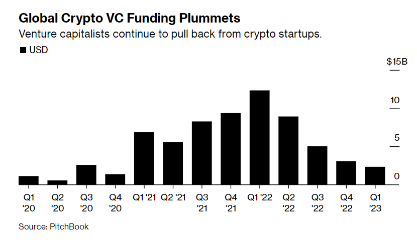Объем инвестиций в венчурные криптофонды обвалился до показателей 2020 года. Об этом сообщает Bloomberg со ссылкой на данные аналитической площадки PitchBook. Согласно подсчетам, по итогам I квартала 2023 года размер вложений в криптофонды составил $2,4 млрд, что на 80% ниже от исторического максимума за этот же квартал в 2022 году (тогда фонды привлекли $12,3 млрд).