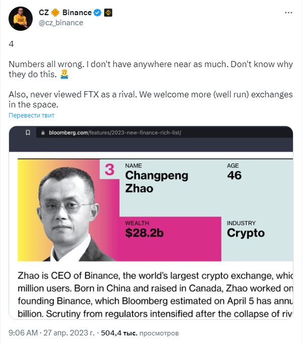 Он прокомментировал сообщение Bloomberg, согласно которому его состояние оценивается в $ 28,2 млрд, благодаря чему он занимает третье место среди самых богатых людей в категории криптовалют.