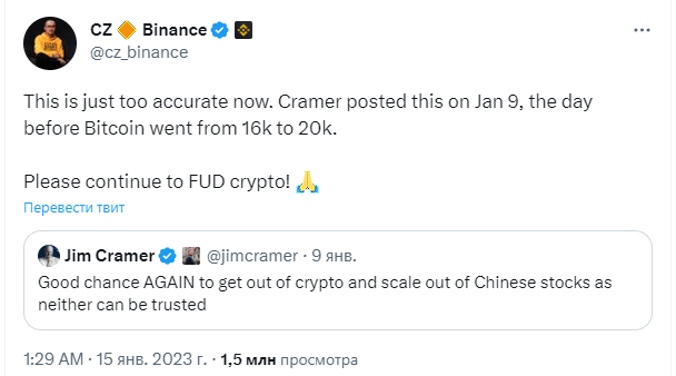 В течение недели после того, как Крамер сделал заявление об очередном обесценении биткоина, BTC подорожал более чем на 25%, и генеральный директор Binance попросил его продолжать распространять FUD о криптовалюте.