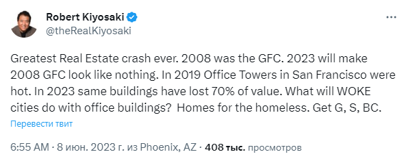 Указывая на проблемы в отрасли, Кийосаки приводит в пример офисные здания Сан-Франциско, которые резко упали в цене из-за того, что туда не вернулись покинувшие их во время пандемии сотрудники. По мнению предпринимателя, лучшими средствами сбережения во время экономического спада являются золото, серебро и биткоин (BTC).