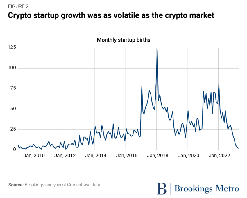 В Брукингском институте полагают, что на рынке сказалось несколько факторов. Во-первых, падение рыночных котировок. Рынок все еще далек от показателей прошлого ралли, хотя и остается выше уровня 2017 года. Во-вторых, банкротства. Криптовалютный рынок буквально погряз в банкротствах вскоре после коллапса биржи FTX. В-третьих, многие криптопредприниматели показали себя далеко не с лучшей стороны на фоне негативных событий.