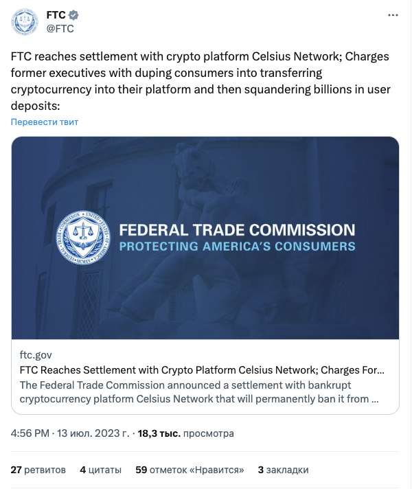 Федеральная торговая комиссия США (FTC) объявила об урегулировании претензий к Celsius Network. Соглашение предусматривает выплату криптолендинговой платформой $4,7 млрд.