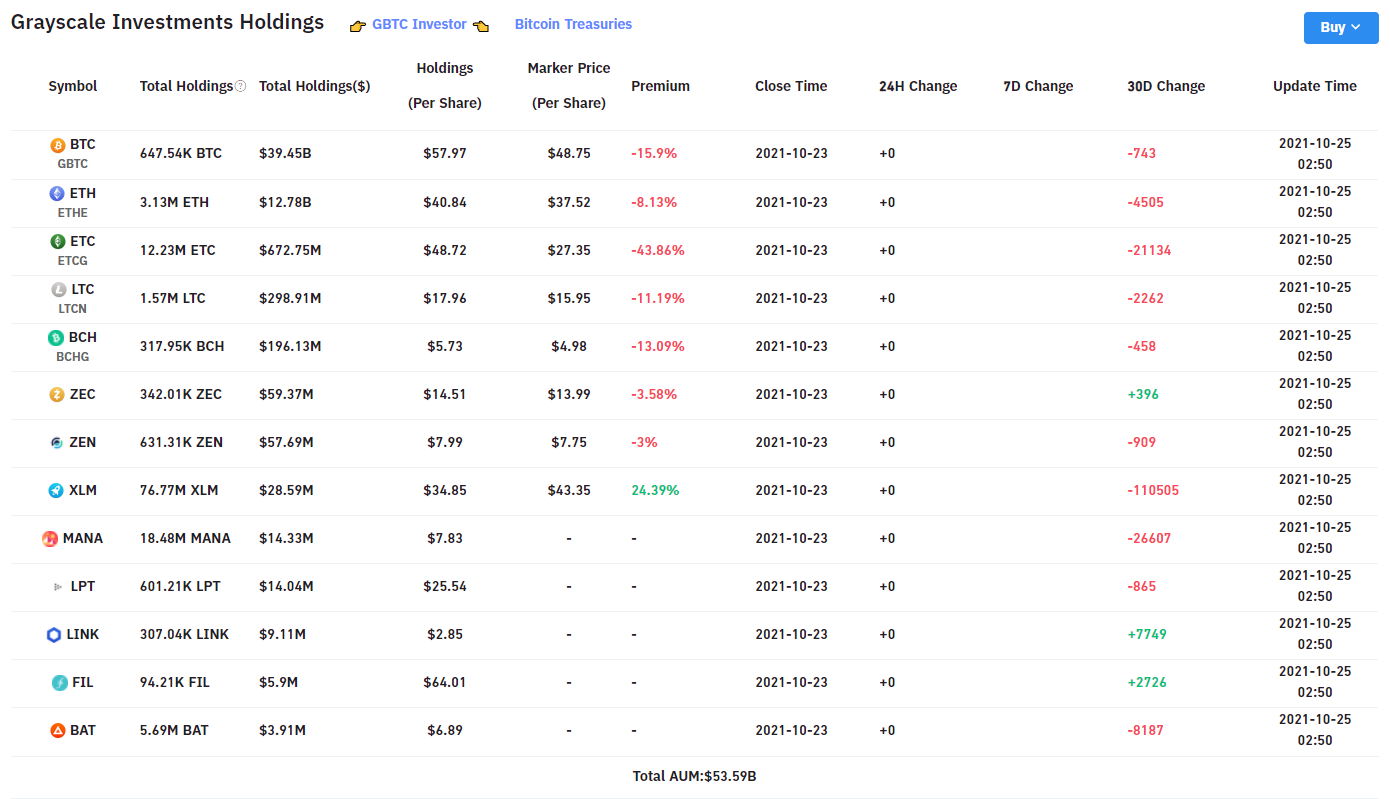 Фонд предлагает инвесторам финансовые продукты в Биткойнах ETH, Zcash и прочих криптовалютах. Конечно же первую строчку занимает Биткойн. На 18 октября фонд управлял BTC на сумму свыше 39 миллиардов долларов. Потом идет ETH, на 11, 8 миллиардов долларов. Кроме этого, фонд управляет Ethereum Classic (643 миллиона), Лайткоин (287 миллиона), Bitcoin Cash (193 миллиона). Несколько лет назад фонд управлял еще и XRP, но сейчас в портфеле нет данного токена.