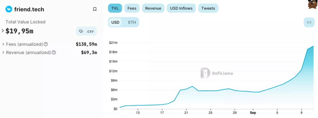 После «клинической смерти» Web3-соцсеть Friend.Tech вновь демонстрирует рост активности. С 28 августа общая заблокированная стоимость средств в протоколе подскочила на 210% — с $6,4 млн до $19,95 млн.