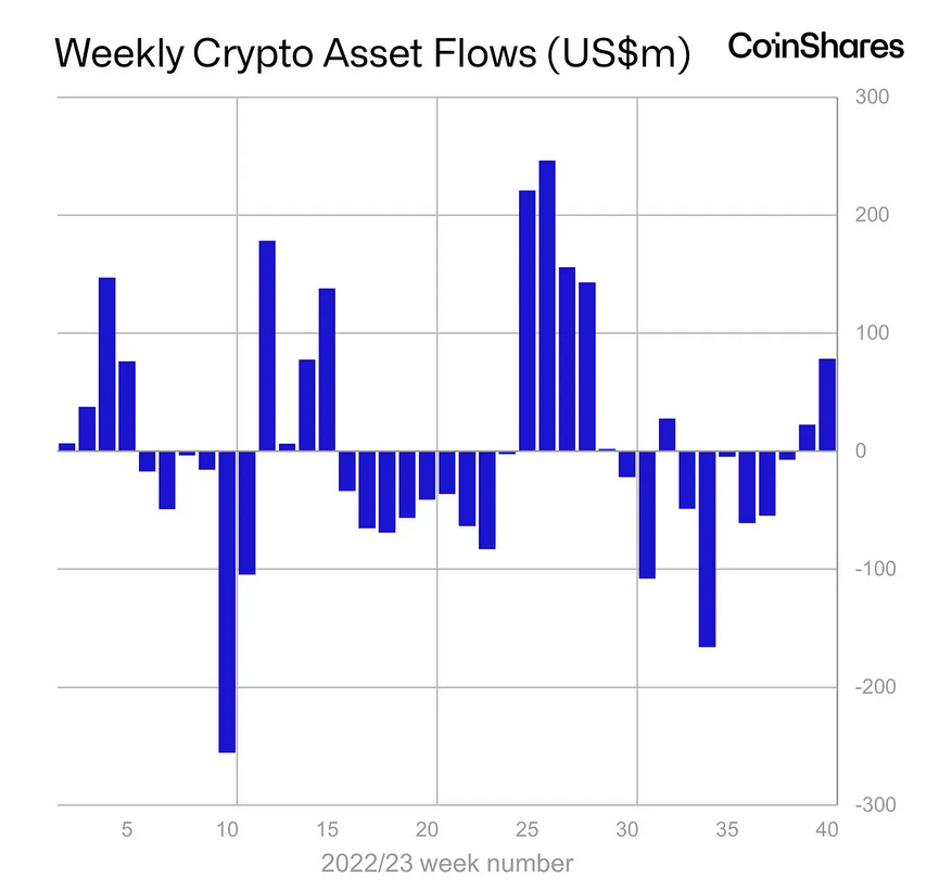 Вторую неделю подряд на крипторынке наблюдается приток капитала в инвестиционные продукты с цифровыми активами. Согласно последнему отчету CoinShares, на прошлой неделе участники крипторынка суммарно инвестировали $78 млн. Это самый высокий результат с июля этого года.