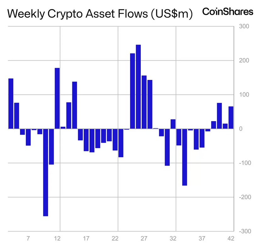 Пятую неделю подряд аналитики CoinShares наблюдают приток средств в инвестиционные продукты с криптовалютами. За неделю с 23 по 27 октября крипторынок увидел $326 млн, что стало крупнейшим показателем с июля 2022 года.