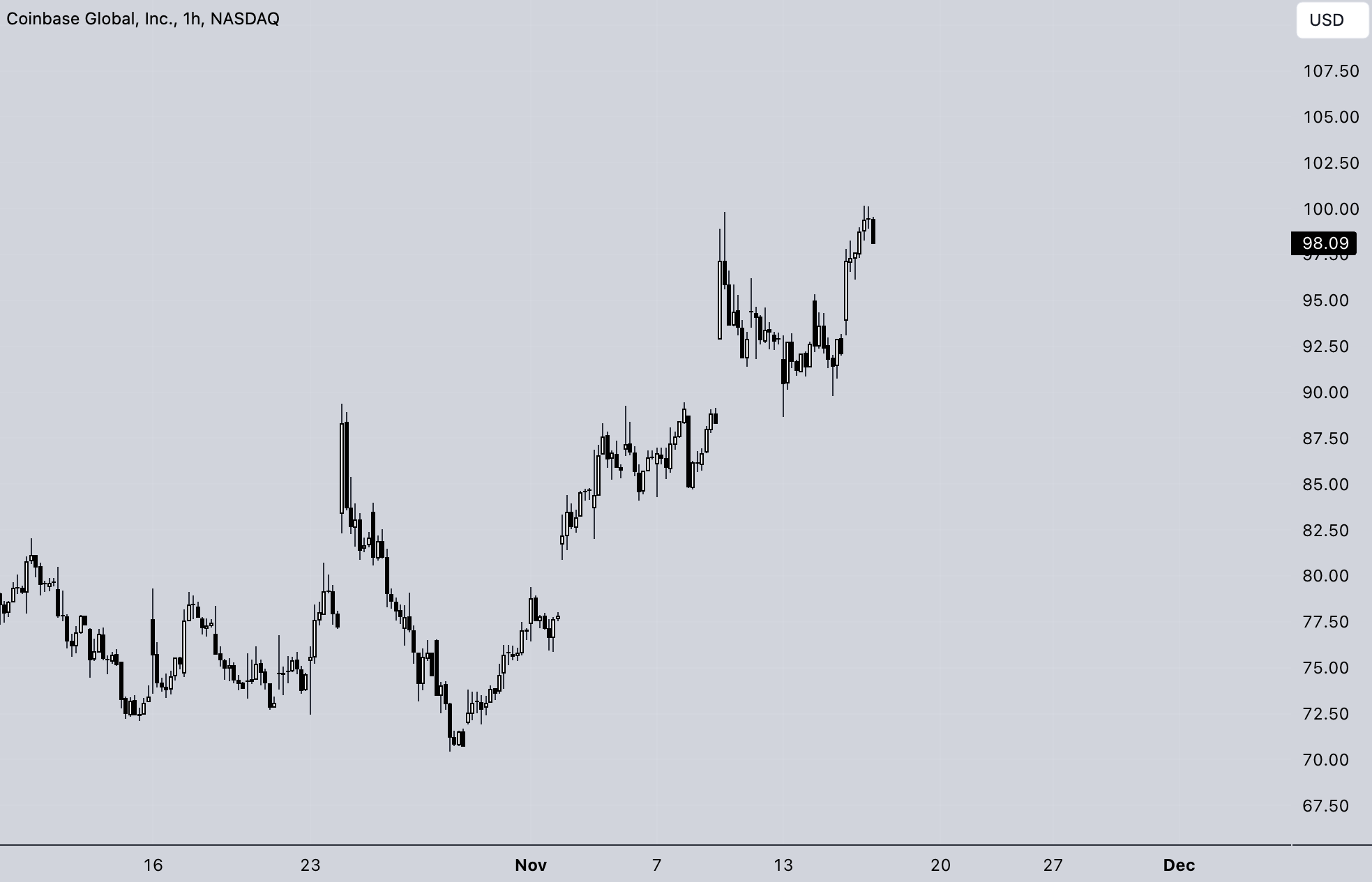 Ценные бумаги публичных компаний, связанных с криптовалютами, продолжают дорожать на протяжении нескольких недель на фоне ралли на рынке цифровых активов. С 16 октября, когда биткоин начал стремительный рост после появившихся слухов относительно одобрения спотового ETF, цена акций Coinbase выросла на 26,5% согласно сервису TradingView.