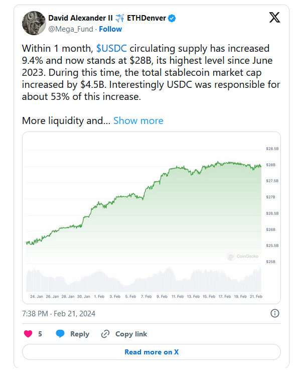 Исследователь Anagram Дэвид Шаттлворт отметил, что предложение $USDC выросло почти на 10% за последний месяц и обеспечило более половины общего роста сектора стабильных монет. Он добавил, что все больше ликвидности и пользователей выходят на рынок, и $USDC постепенно отвоевывает его долю.