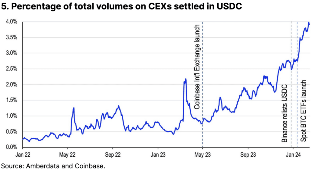 Согласно предоставленным данным, Circle стремится к расширению $USDC за пределами США. Рыночная доля стейблкоина в расчетах на централизованных биржах выросла с менее 1% в середине 2023 года до почти 4%.