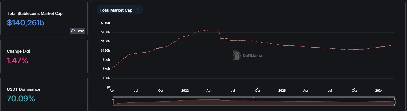 27 февраля 2024 года рыночная капитализация стейблкоинов достигла $140 млрд, по данным DeFi Llama. Это самый высокий уровень с декабря 2022 года.