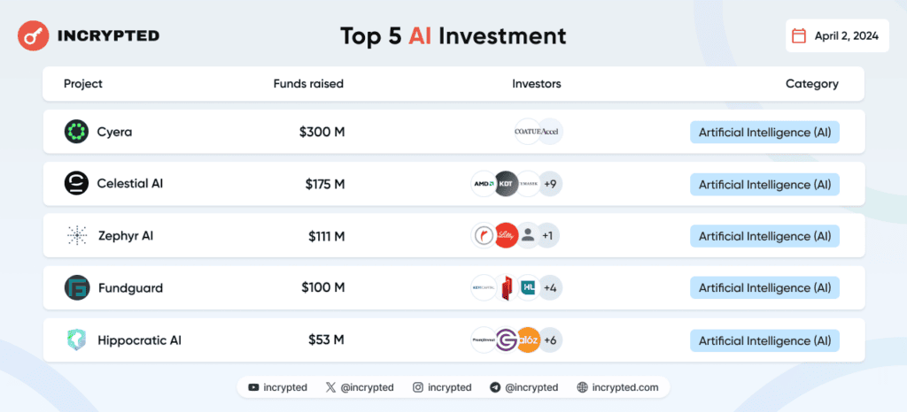 В марте проекты, ориентированные на ИИ, привлекли инвестиции. Редакция Incrypted отобрала топ-5 проектов, которые получили наибольшее финансирование.