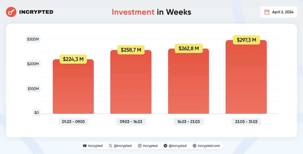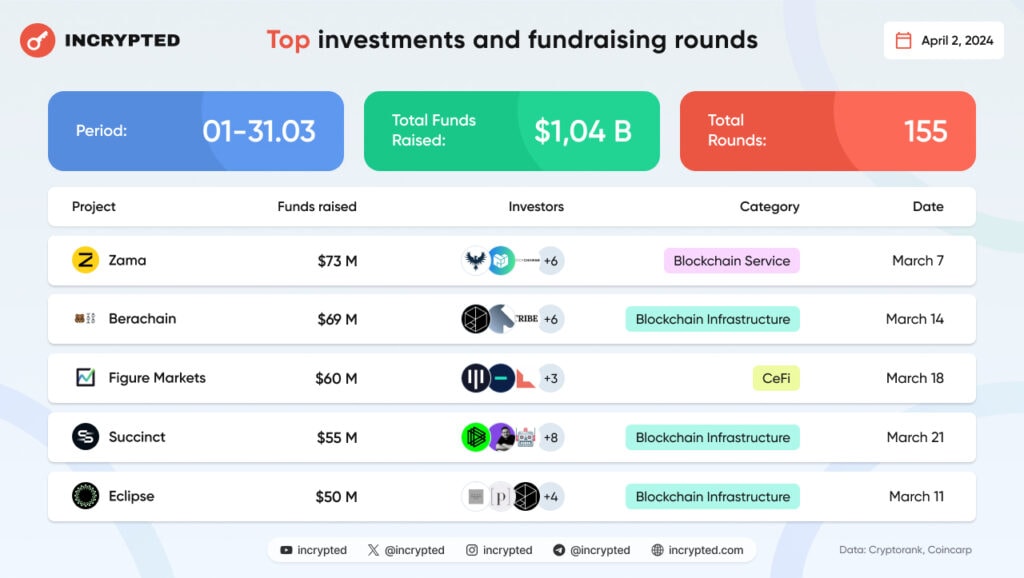 В марте 2024 года 155 проектов из сферы Web3 и блокчейна привлекли финансирование на общую сумму $1,04 млрд. Редакция Incrypted подробно разобрала инвестиции этого месяца.