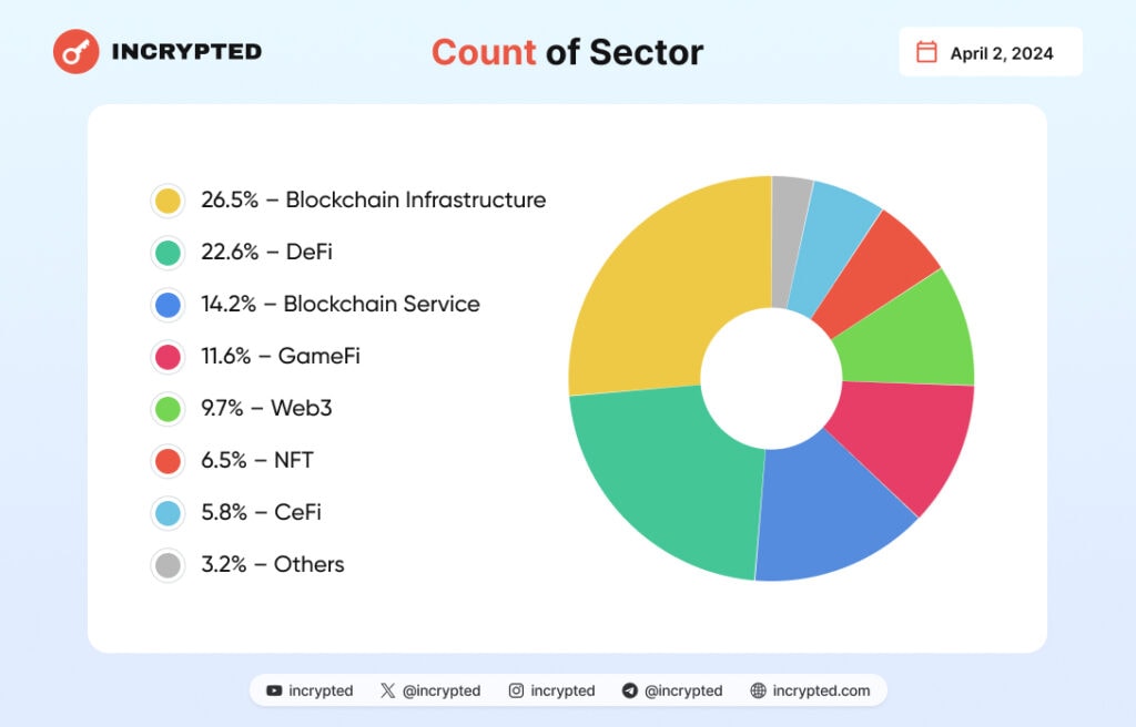 Больше всего инвестиций в размере $297,3 млн проекты привлекли в период с 23 по 31 марта. Тогда лидерами по сумме полученного финансирования стали проекты 0G Labs и Parallel, а внимание фондов было сосредоточено на секторах разработки блокчейн-сервисов и инфраструктуры.