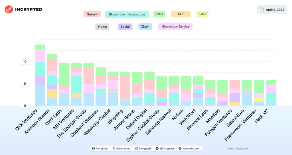 Согласно CryptoRank, самым активным инвестором в марте стал OKX Ventures. Фонд вложил средства в 14 стартапов.