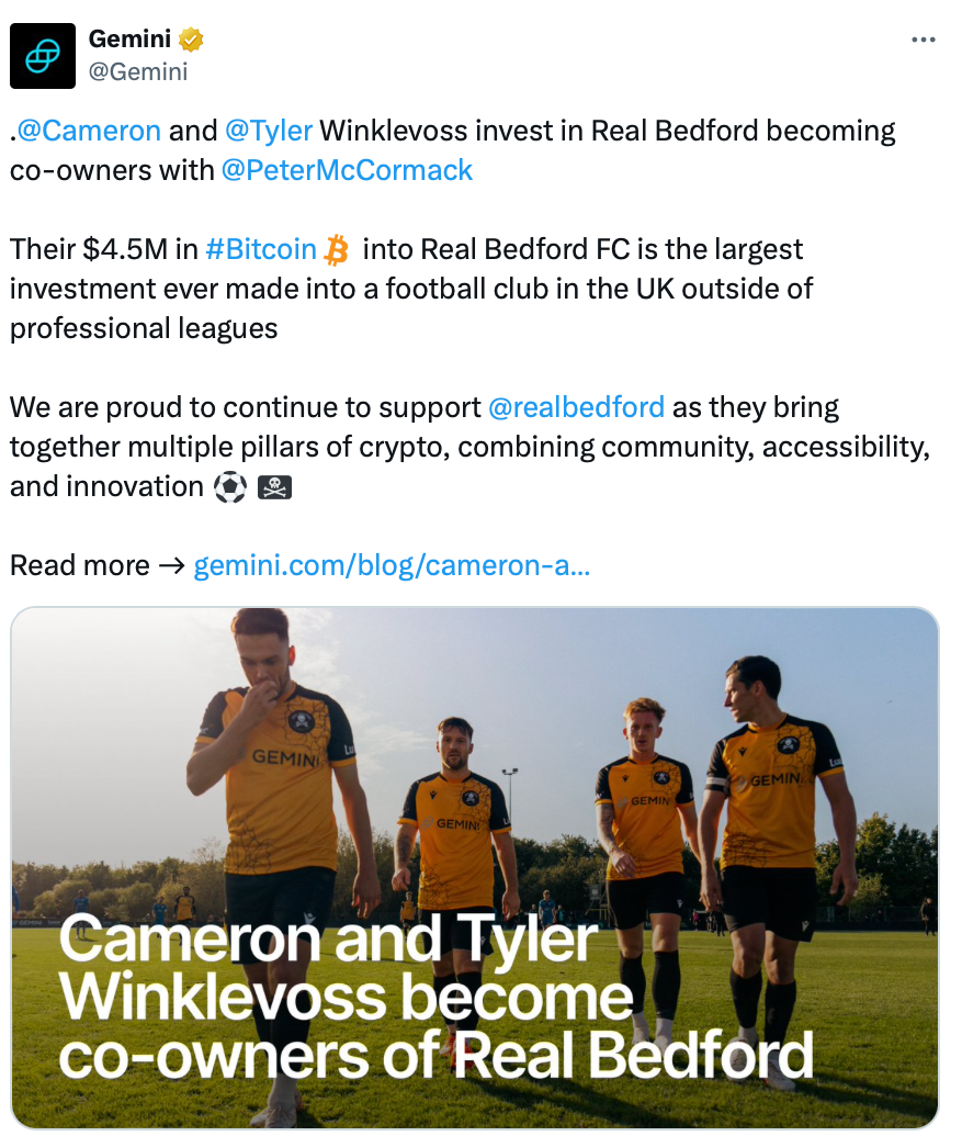 Кэмерон и Тайлер Уинклвосс стали совладельцами футбольного клуба «Реал Бедфорд» (RBFC) биткоин-подкастера Питера МакКормака после того, как инвестировали биткоины на сумму 4,5 миллиона долларов для поддержки планов клуба.