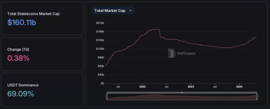 Согласно аналитической платформе DefiLlama, общая капитализация стейблкоинов в настоящее время превышает $160 млрд. USDT является бесспорным лидером в этом сегменте, занимая более 69% рынка.