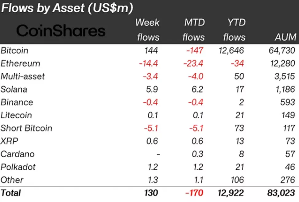 В связанные с биткоином инструменты клиенты направили $144 млн против оттока в размере $251 млн в предыдущий отчетный период.