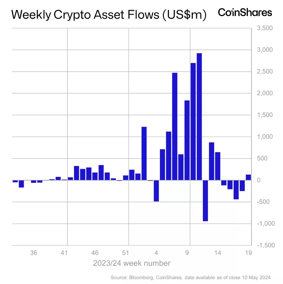 Приток в криптовалютные инвестпродукты с 4 по 10 мая составил $130 млн. Такие расчеты привели в CoinShares.