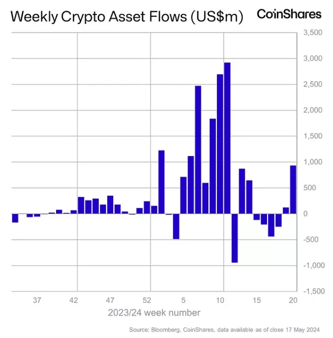 Приток в криптовалютные инвестпродукты с 11 по 17 мая составил $932 млн. Такие расчеты привели в CoinShares.