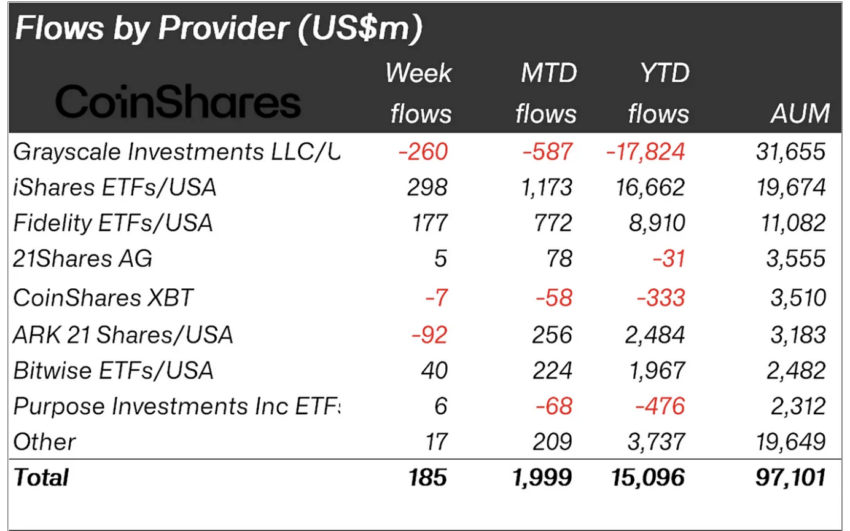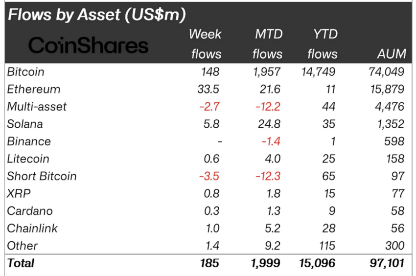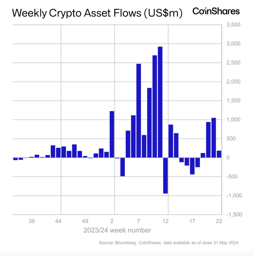 На прошлой неделе — с 27 по 31 мая — в инвестиционные продукты на базе криптовалют инвестировали в совокупности $185 млн