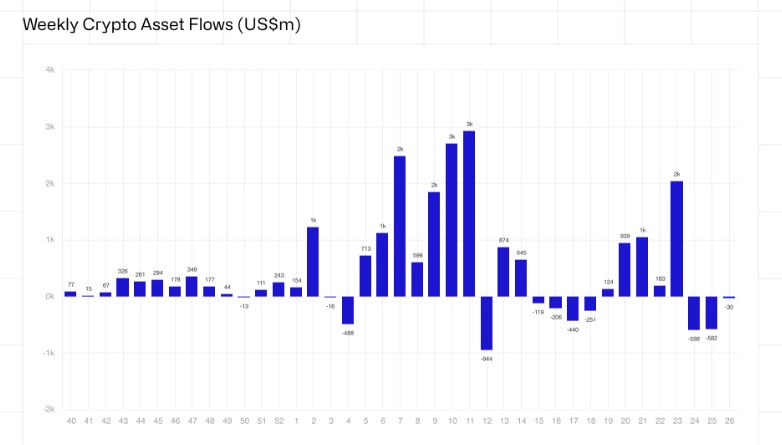 Отток капитала из регулируемых криптовалютных инвестпродуктов продолжился третью неделю подряд, в совокупности превысив $1 млрд. За минувшую неделю с 24 по 28 июня отток составил $30 млн — это минимальный показатель с апреля, по данным CoinShares.