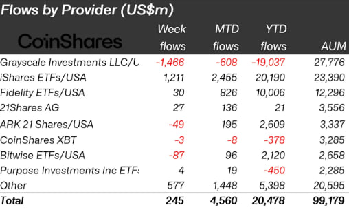 Приток/отток капитала в секторе криптофондов в разрезе поставщиков ETF в США Источник: CoinShares.