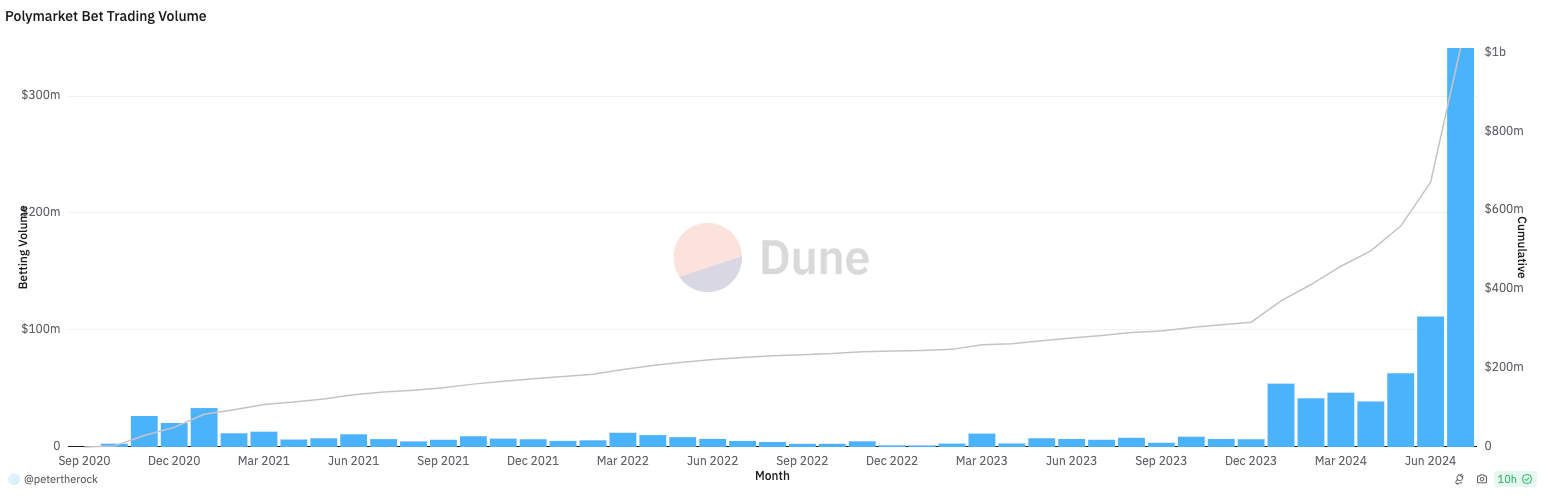 По данным Dune Analytics, объем ставок на Polymarket по состоянию на 30 июля составил $343 млн, что значительно больше, чем $111 млн в июне и $63 млн в мае.