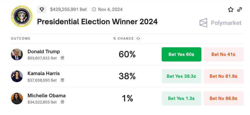 На победу в предстоящих выборах сделаны ставки на 429 миллионов долларов. Источник: Polymarket.