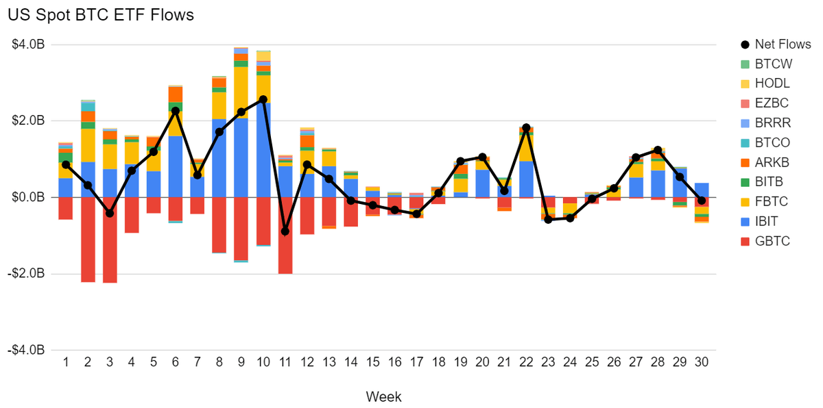 Приток и отток капитала из спотовых Биткоин-ETF в США по неделям