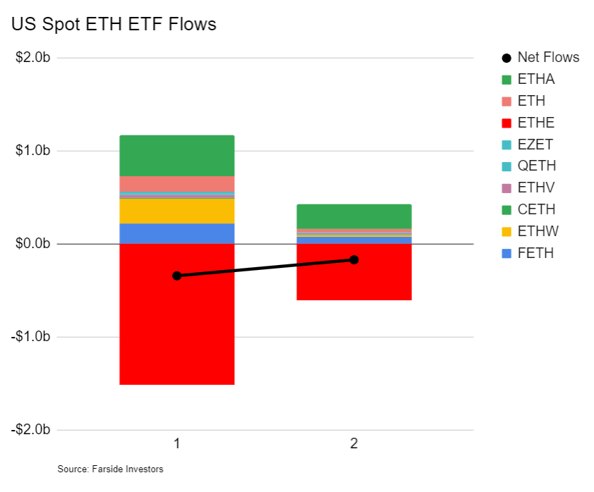 Изменить такое положение вещей может большой приток средств в Эфириум-ETF в следующие несколько месяцев. Пока что они преимущественно демонстрируют чистый отток капитала.