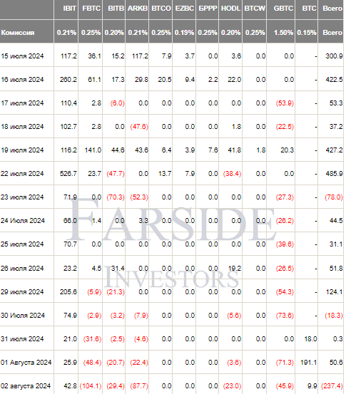 Наибольший отток средств в прошедшую пятницу был зафиксирован биткоин-фондом Fidelity Wise Origin (FBTC), из которого вывели $104,1 млн. Далее следует совместный ETF от Ark и ARKB 21Shares с оттоком в размере $87,7 млн.