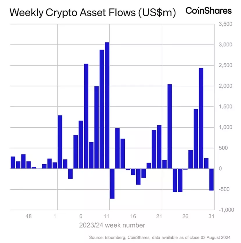 Отток из криптовалютных инвестфондов с 27 июля по 2 августа составил $528 млн, что более чем вдвое выше поступлений неделей ранее ($245 млн). Такие данные привели в CoinShares.