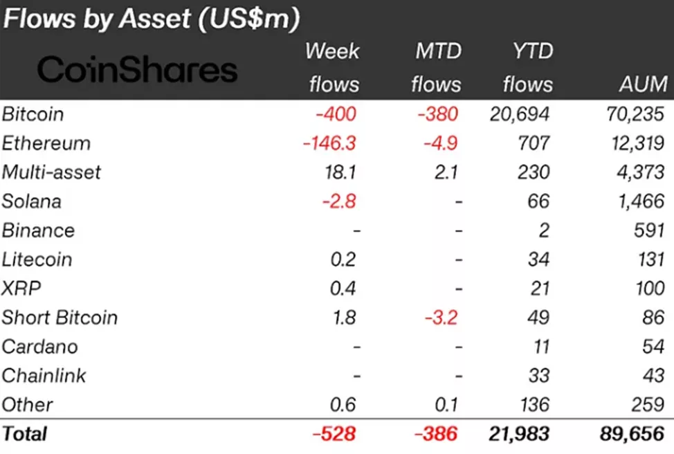 Из связанных с биткоином продуктов клиенты вывели $400 млн после притока в $519 млн неделей ранее. В структуры, которые позволяют открывать шорт по цифровому золоту, инвесторы внесли $1,8 млн (ранее $0,3 млн).
