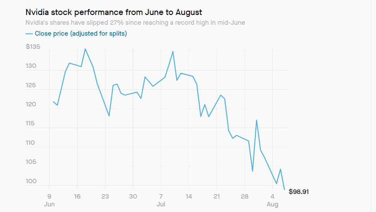Цена акций Nvidia, ведущего производителя микросхем, который был на переднем крае искусственного интеллекта, значительно упала после того, как в начале этого года взлетела до рекордно высокого уровня. Компания, которая когда-то могла похвастаться рыночной капитализацией в 2 триллиона долларов и даже превысила 3 триллиона долларов, теперь сталкивается с высокой волатильностью рынка.